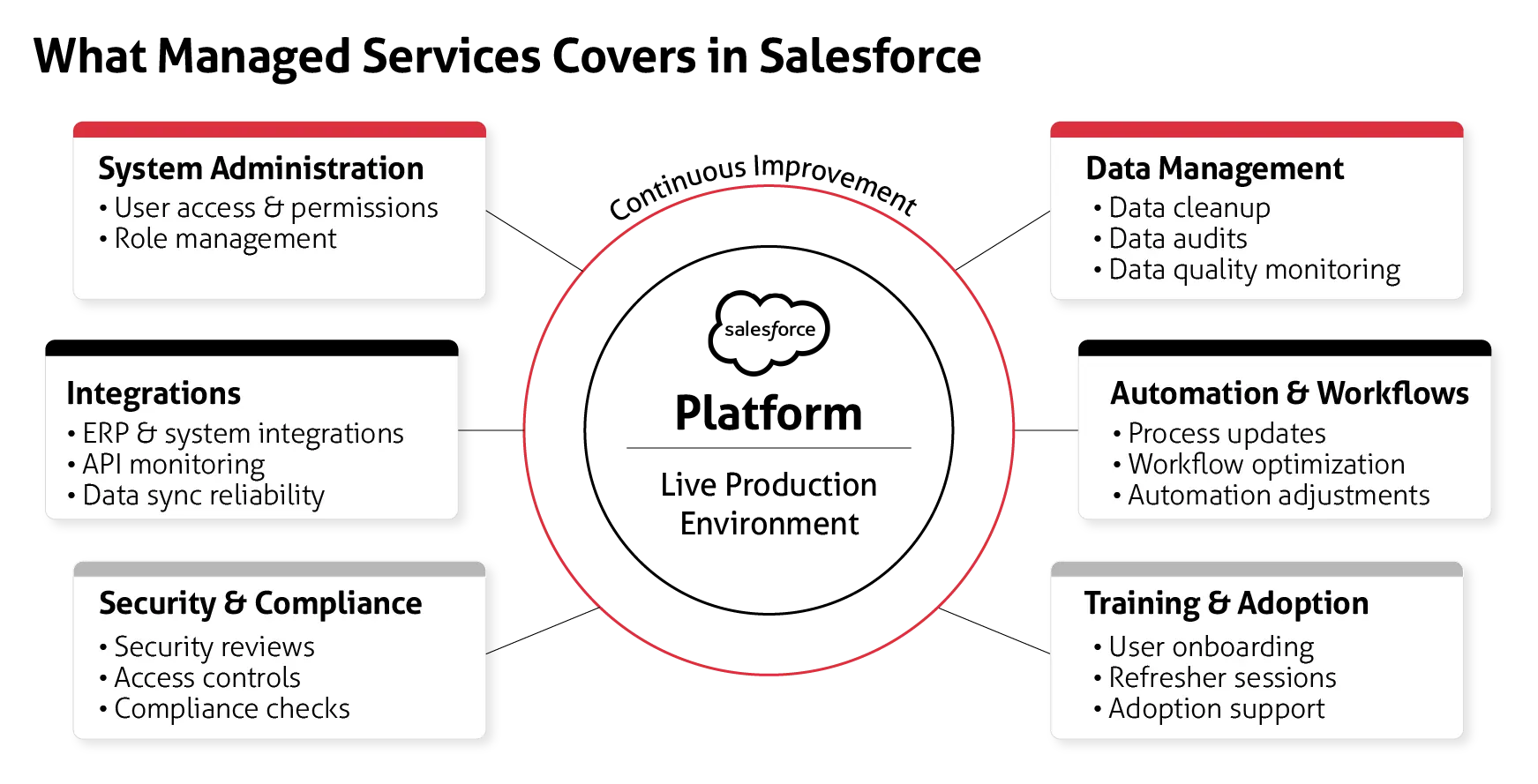 This approach is different from one-time implementation, or Salesforce consulting services, because the work continues beyond the initial setup. It is also different from staff augmentation, as the service includes accountability for outcomes and performance, not just labor.